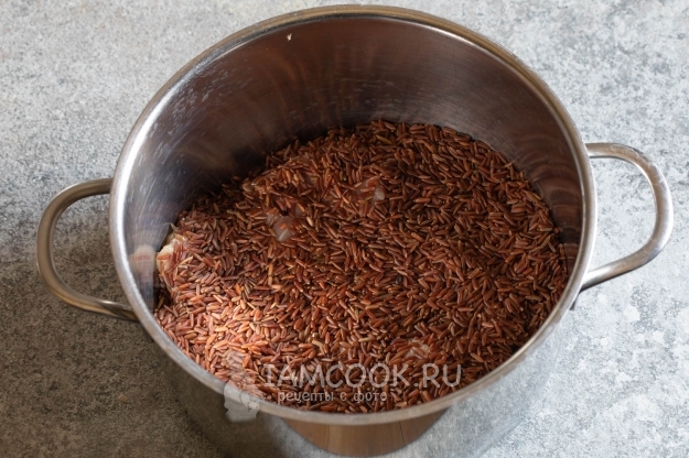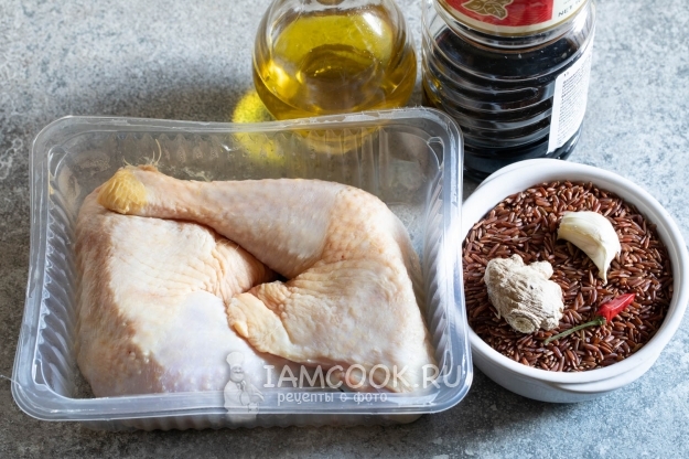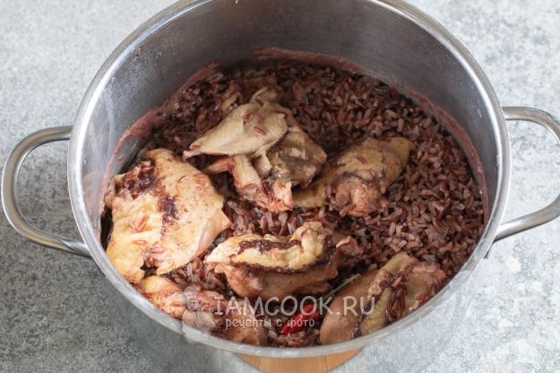Красный рис с курицей у меня сегодня будет в кулинарной технике "мне готовить просто лень, все идите на фиг". Думаю, ей владею не только я, и время от времени к ней прибегает любая женщина. Когда вроде нужно изобразить что-то приличное, но времени и желания нет ВООБЩЕ! Так вот, вы знаете, я тут выяснила, что красный рис - это вещество не только питательное и очень полезное по своим микробиологическим и витаминным свойствам, но и позволяющее отлично маскировать, что... ну вы поняли, да?! - ...что мне готовить просто лень, все идите на фиг. С белым рисом такого трюка, который я тут сейчас покажу, не провернёшь: курочка получится слишком бледной, не выдашь её за жареную и тушеную. А красный рис эту самую курицу благополучно красит, и она получается весьма цивильного коричневатого цвета, нипочём не скажешь, что её просто положили в кастрюлю, залили водой и забыли.