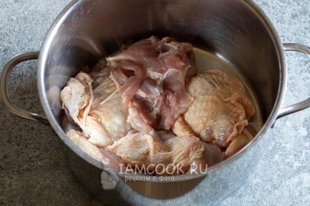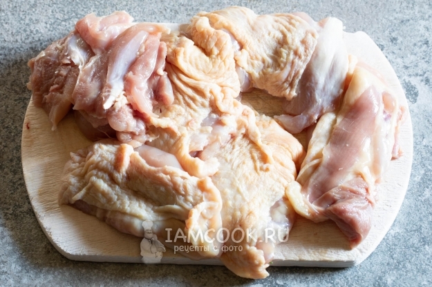 Если курятина с косточками, то удаляем кости и режем её на порционные куски. У меня вот из двух ног получается 6 кусочков. Это первые пять минут, когда хозяйка занята. Если у вас грудки, то времени на разделку потребуется меньше.