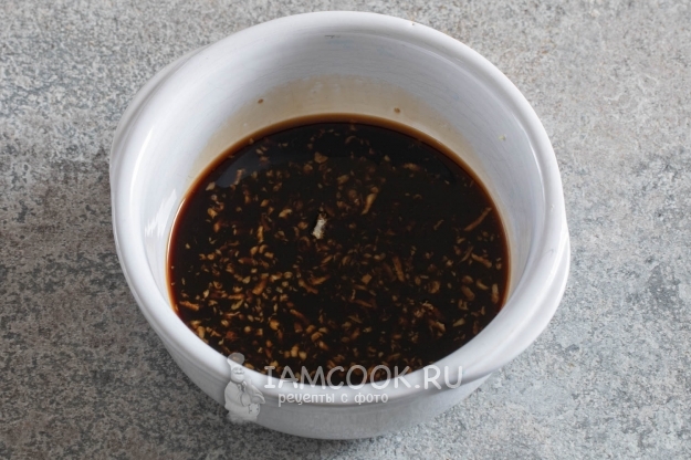 Когда красный рис с курицей уже почти готов, делаем соус: в соевый выдавливаем через чесночный пресс немного свежего имбиря и зубчик чеснока.