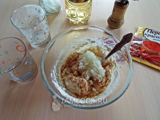 Добавить перец, чеснок, соль и мелко-мелко нарезанный лук.