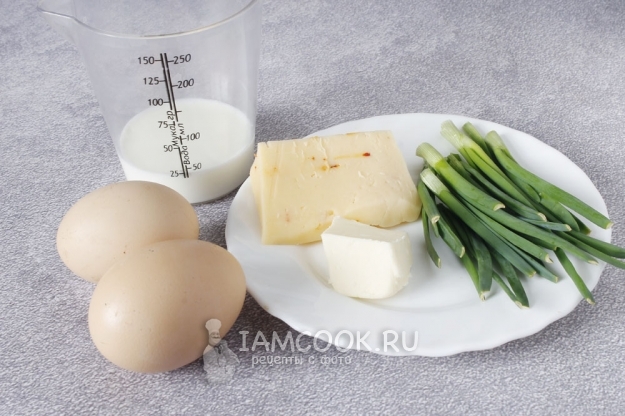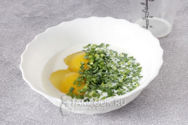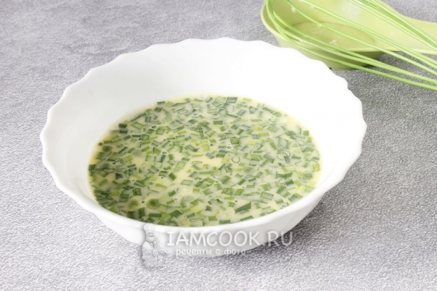В миске соединяем яйца, молоко и зеленый лук, солим по вкусу.