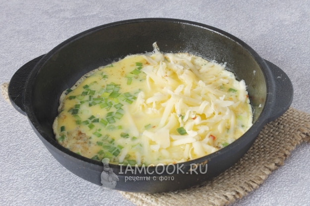 На сковороде (у меня - диаметром 20 см) растапливаем сливочное масло, вливаем яичную массу, на одну половинку насыпаем сыр. Жарим на огне ниже среднего приблизительно 2 минуты. Чем меньше сковорода, тем пышнее получится омлет.