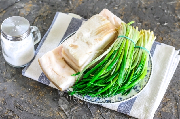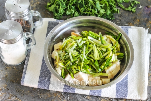 Тщательно промойте черемшу в воде от грязи. Нарежьте средними брусочками и добавьте в емкость к салу.
