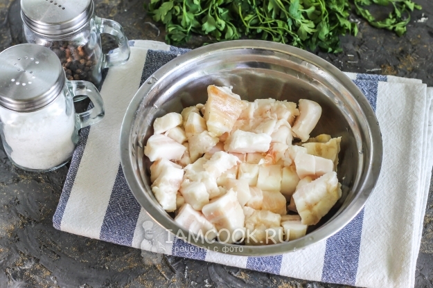 С кусков сала обязательно срежьте кожу - заготовка не должна содержать жестких элементов. Нарежьте сало небольшими кусочками, чтобы оно легко измельчилось.