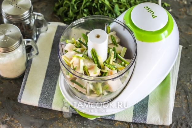 Выложите все вместе в чашу измельчителя. Если сало свежее, то на этом этапе добавьте в чашу и поваренную соль.