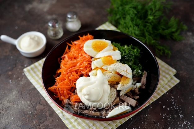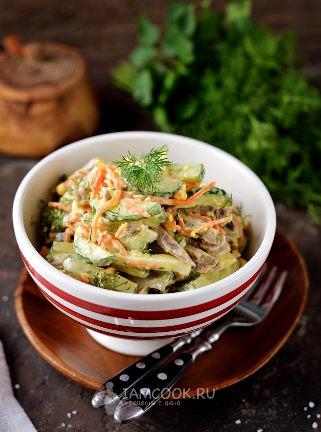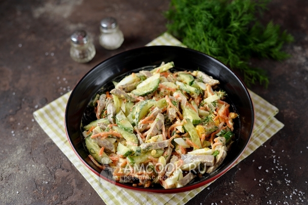Готовый салат из свиного языка с корейской морковью подавайте в качестве закуски.