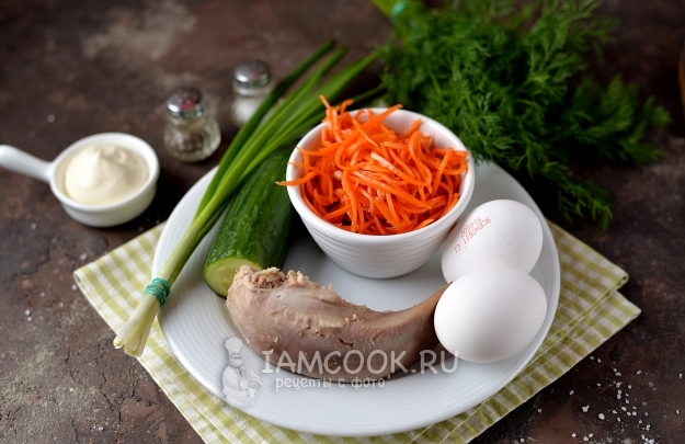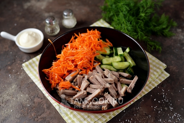 Вареный свиной язык нарежьте тонкой соломкой, слегка измельчите корейскую морковь, так в готовом салате ее будет проще есть.
