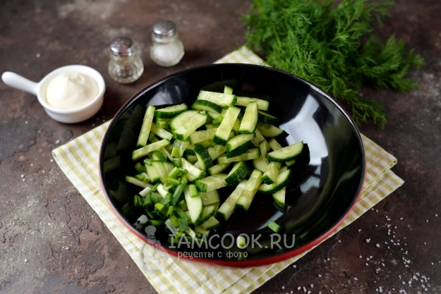 Огурец нарежьте соломкой, измельчите зеленый лук, сложите все в глубокую миску.