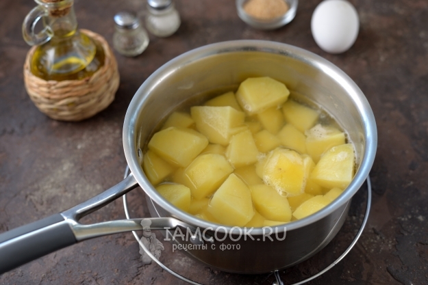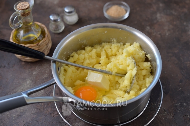 Слейте воду, помните картофель в пюре, добавьте масло и сырое яйцо, чуть поперчите, еще раз хорошенько все перемешайте.