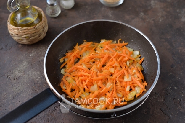 В небольшом количестве постного масла обжарьте нарезанный мелким кубиком лук и натертую на крупной терке морковь.