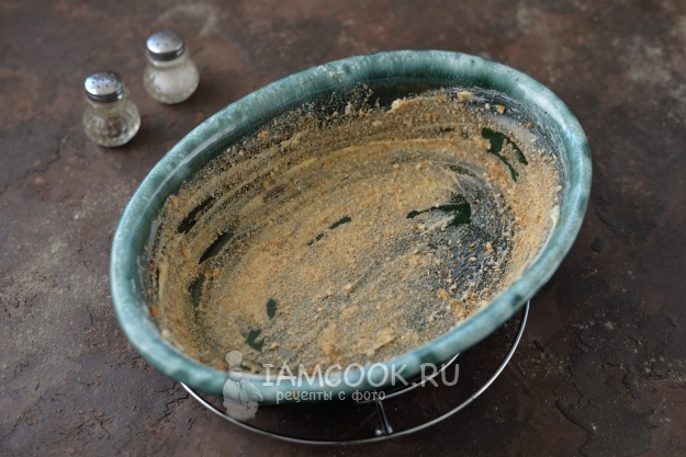 Смажьте форму сливочным маслом, посыпьте сухарями.