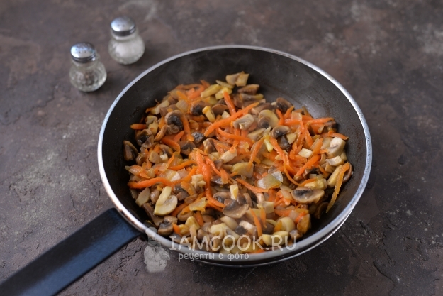 Добавьте мелко нарезанные шампиньоны, жарьте все вместе минут 5. Посолите и поперчите начинку по вкусу, слегка остудите.