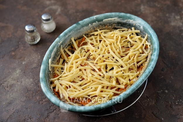На дно выложите половину картофеля, на слой картофеля положите обжаренные с луком грибы, посыпьте половиной натертого сыра.