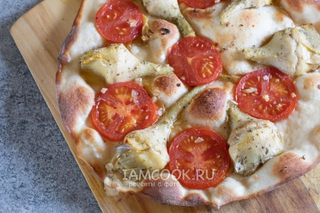 Распределяем по пицце артишоки и помидоры попеременно, не скупимся на масло. Посыпаем всё сверху рубленым чесноком и солью.