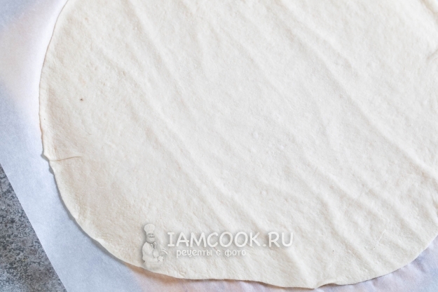 Тонко раскатываем тесто для пиццы, диаметр должен быть не менее 30 см.