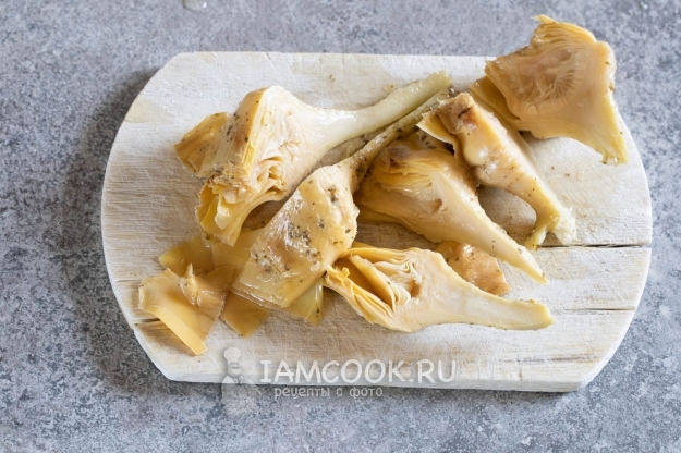 Если артишоки в банке цельные, то их разрезаем на две половины по оси.