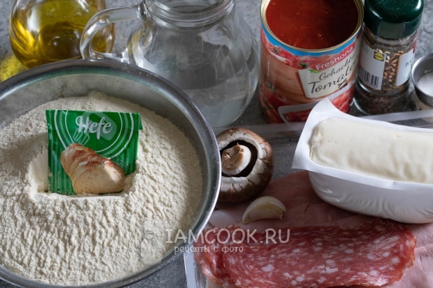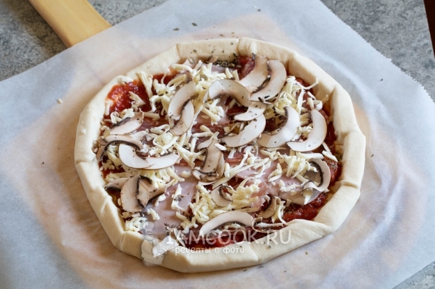 Наполняем пиццу начинкой. В моем случае это томаты, чесночный соус, ветчина, салями, тёртая моцарелла и шампиньоны, плюс соль и орегано.