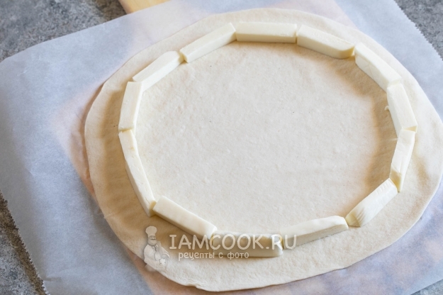 Отступив пару сантиметров от бортика, выкладываем кольца из брусочков моцареллы и тщательно прижимаем тесто, обернув вокруг сыра.