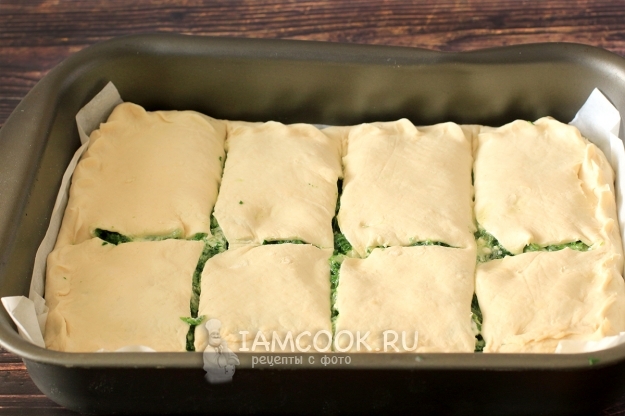 Надрежьте пирог ножом, стараясь не прорезать дно, и смажьте оставленным ранее яйцом. Выпекайте при 180 градусах до румяного цвета.