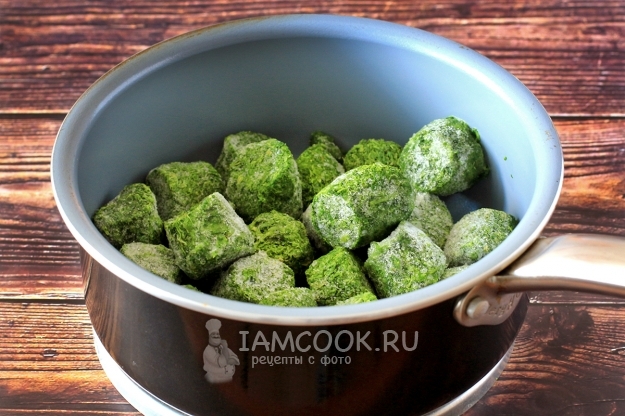 Замороженный шпинат держите на малом огне до полного оттаивания.