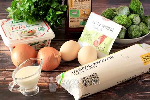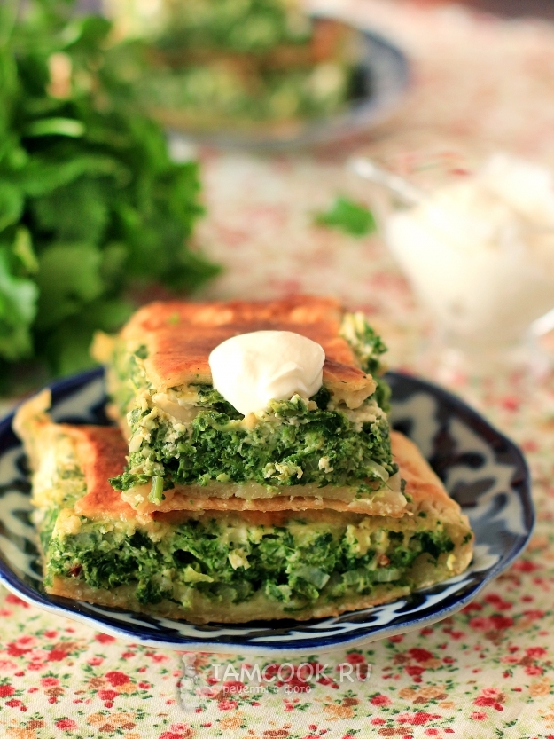 Для пирога можно брать свежий и замороженный шпинат. Сыр же должен иметь кислинку и солоноватость во вкусе, так он лучше сочетается с пресным шпинатом. В Греции принято класть в начинку лук порей. У нас же этот вид лука идет по цене самолета, поэтому берем обычный репчатый.