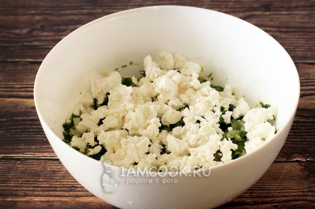 Раскрошите рассольный сыр. У меня это мягкая фета, но лучше если сыр будет плотнее по структуре. Слегка смешайте начинку и, если нужно, посолите. Так как фета достаточно соленая, начинку я больше не солила.
