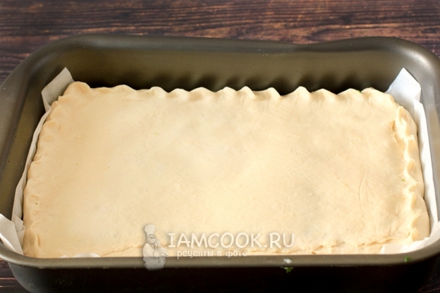 Накройте вторым пластом теста и тщательно скрепите края, подворачивая их внутрь. По ребру теста можно сделать фигурные защипы для красоты.