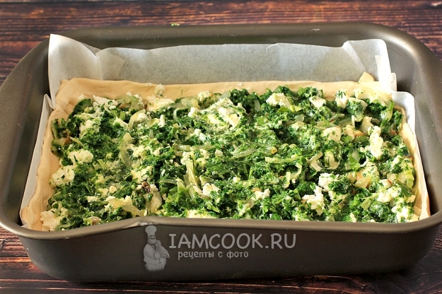 Тесто разделите на две части. В удобную форму выложите пласт тонкого слоеного теста, распределяя его по размеру формы, а поверх разложите всю начинку. Мое тесто было уже тонко раскатано и свернуто в рулет. Мне осталось его лишь развернуть.