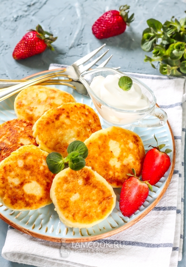 Подавать сырники лучше всего со свежей сметаной любой жирности и ягодами, фруктами. Можно дополнить их различными сладкими соусами, джемами или вареньем.