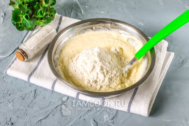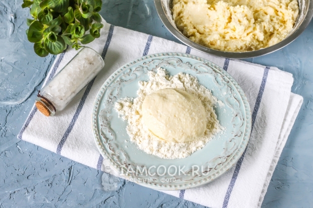 Всыпьте пшеничную муку, заранее ее просеяв. Замесите неплотное творожное тесто. Оставьте его в покое на 15-20 минут, накрыв полотенцем.