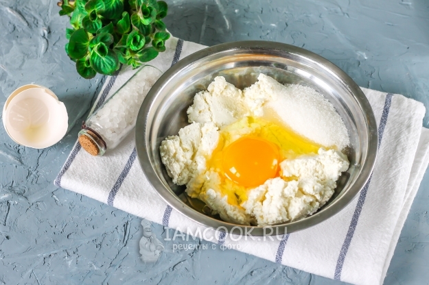 Творог выложите в миску и помните вилкой, разрыхлите его. По желанию можно протереть через сито. Вбейте в емкость куриное яйцо, всыпьте соль и сахар. Тщательно вымешайте все содержимое емкости до однородности.