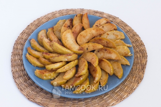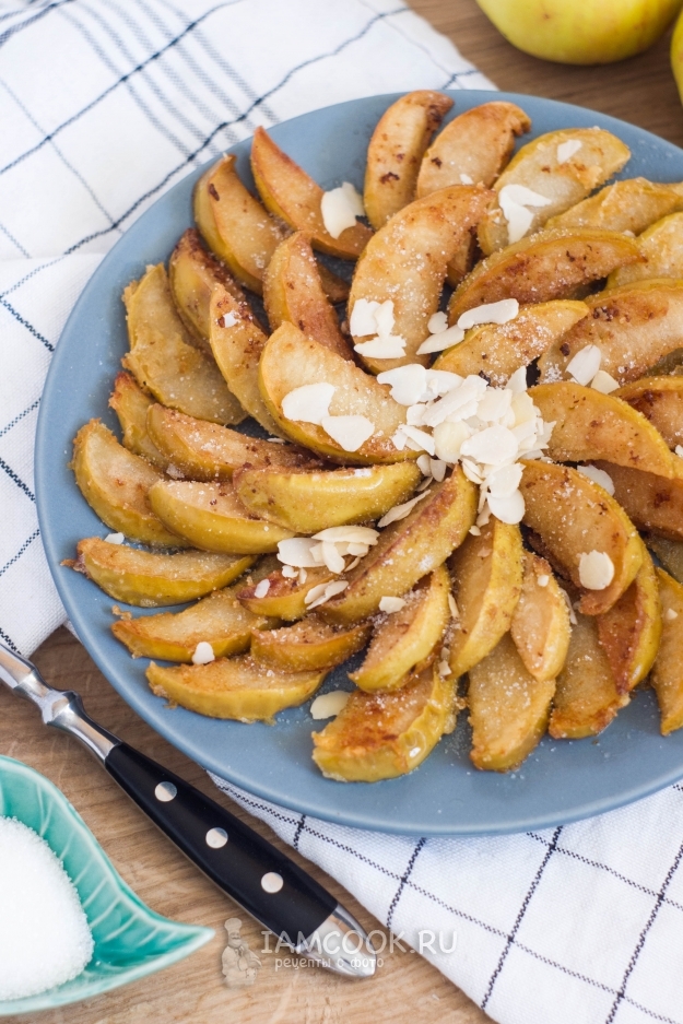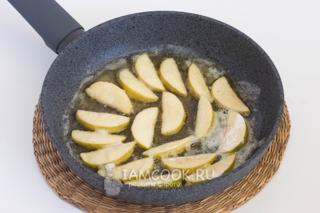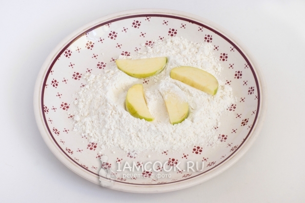 Основная особенность этого рецепта заключается в том, что четкой массы продуктов здесь нет, скорее, это технология. Сложно сказать, сколько уйдет муки или сахара. Яблоки я брала некрупные, средние по вкусу: не сильно сладкие и не кислые. При обжаривании на дольках яблок образуется небольшая аппетитная корочка, а сливочное масло в сочетании с сахарной посыпкой придает карамельный привкус. Поскольку меня смущает тот факт, что сливочное масло само по себе начинает быстро гореть, то я добавила на сковородку еще немного оливкового масла.