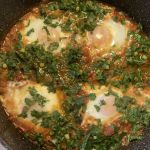 В получившийся соус вбиваем яйца, перед этим сделав для каждого яйца лунку. Яйца должны как бы утонуть в соусе. Накрываем сковороду крышкой, уменьшаем огонь и даём яйцам свариться, но слегка, чтобы белок побелел, а желток остался жидким.