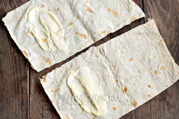 Длинный лаваш разрежьте на прямоугольные куски одинакового размера. У меня получилось 5 экземпляров. Уложите их на рабочую поверхность, разровняйте. Все процессы совершайте как можно быстрее, чтобы лаваш не успел засохнуть, мягкий лаваш будет легче свернуть в рулет. С одной стороны лавашей сделайте полоску из майонеза, оставляя немного свободного места по бокам. На один экземпляр я использовала 1 ст.л. майонеза без горки.
