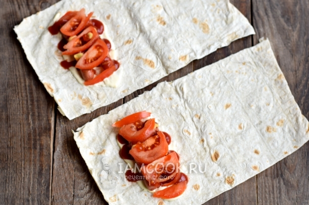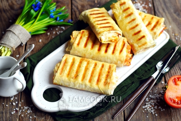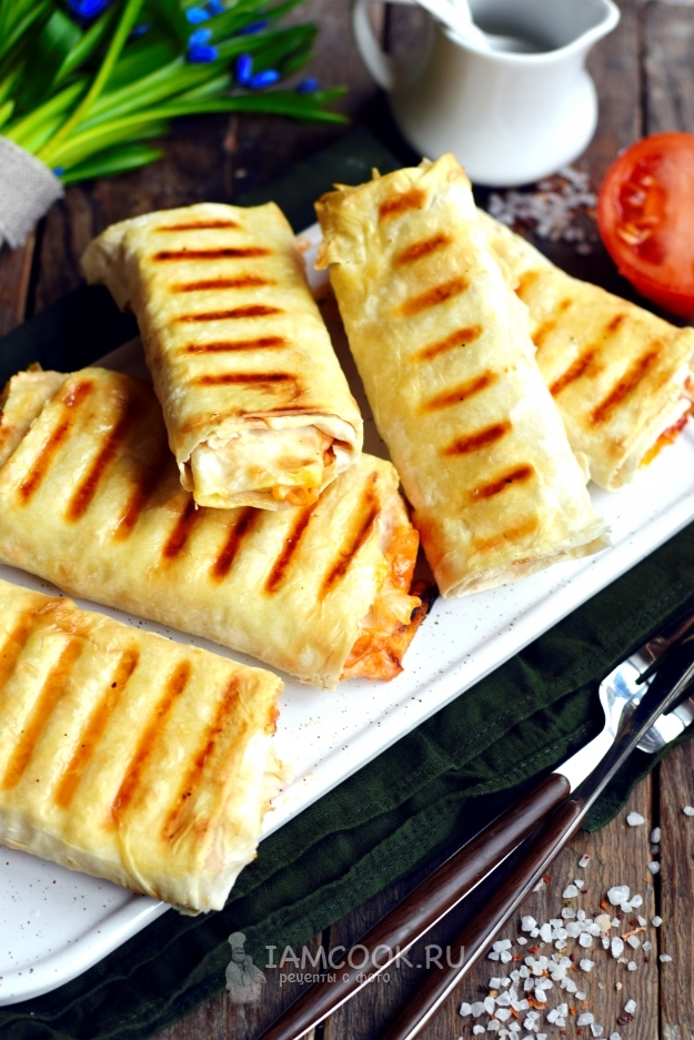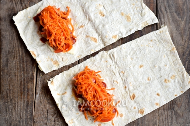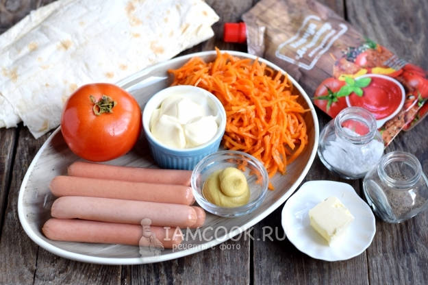 Вместо привычной булки берем тонкий лаваш, который полностью запечатает начинку, и она не будет вываливаться из него. В качестве начинки используем сосиски, для сочности берем помидор, для остроты — морковь по-корейски. Также обязательно дополняем его соусами. Готовый хот-дог жарится на гриле, который делает его не только красивым, но и хрустящим, ароматным и аппетитным.