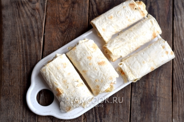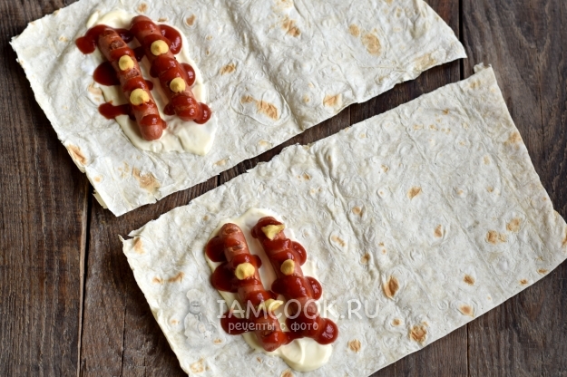 Начинку немного посолите и поперчите, после заверните боковые стороны, сверните в рулеты как можно плотнее. Экземпляры с двумя сосисками получатся чуть шире.