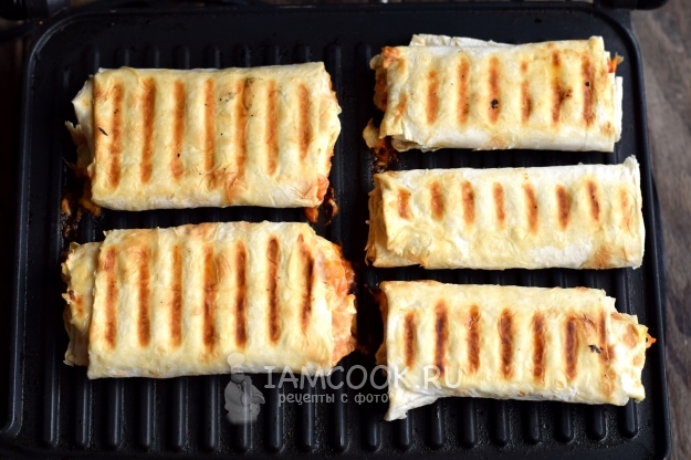 Заготовки уложите на сухой гриль, жарьте две минуты, после поверхность смажьте сливочным маслом, так изделия приобретут красивую, блестящую и румяную корочку. Жарьте хот-доги в лаваше на гриле 3-5 минут на сильном огне.