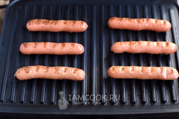 В первую очередь поджарьте сосиски до появления легкой румяной корочки. Если жарить их на электрогриле, тогда масло использовать не нужно. Сильно зажаривать сосиски не стоит, они должны оставаться сочными и мягкими.