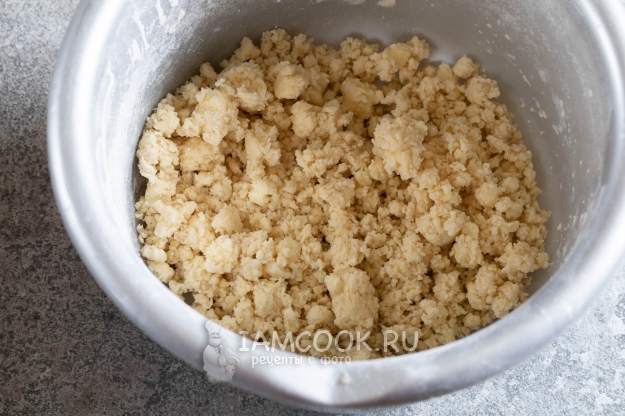 Миксером вымешиваем крошковатое тесто из масла с мукой. Когда всё масло разбилось на мелкие комочки, начинаем по ложечке подливать ледяную воду, пока тесто не сформируется вот в такую вот ещё комковатую, но уже не сухую массу.