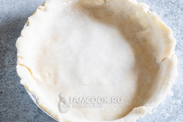 Формируем из теста ком, раскатываем его на обсыпанной мукой поверхности в круг диаметром около 25 сантиметров и выстилаем тестом форму диаметром около 20 сантиметров.