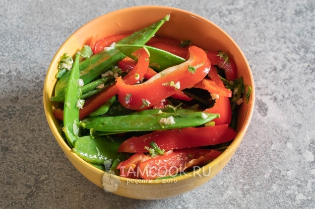 Салат из стручков гороха можно приготовить, собственно, хоть из одних стручков гороха. Они всё равно вкусные. Но я считаю, что с ними ещё хорошо сочетается сладкий болгарский перец. Вообще, в этом рецепте мне хочется поговорить даже не о составе ингредиентов, а о том, какими именно должны быть для этого салата сами стручки, и какой интересной обработке их имеет смысл подвергнуть, если вы хотите, чтобы они стали зеленее и мягче. Нет, не то чтобы мягкими, как маринованные, - они останутся упругими, всё в порядке! Просто не будут сухими и жёсткими, чем этот продукт иногда грешит.