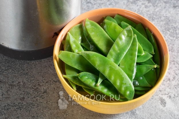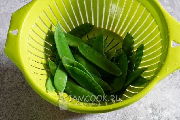 Второе. Гороховые стручки, даже такие молодые, всё-таки чуть-чуть жестковаты. Они становятся значительно приятнее, если... ну, а вот отсюда уже переходим к рецепту!
