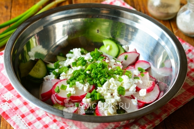 Добавить мелко нарезанный зеленый лук, он придаст салату легкую остроту, не более того. Такая пикантная нотка многим придется по душе в сочетании с овощами и творогом.