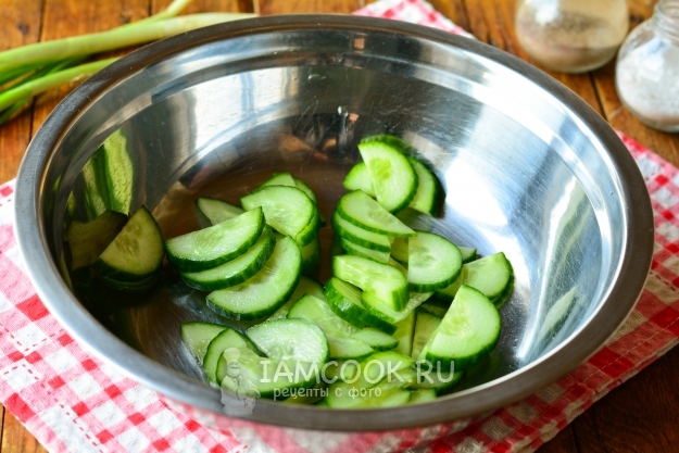 Вымыть огурцы, срезать концы и нарезать полукружочками. Сложить овощи в миску.