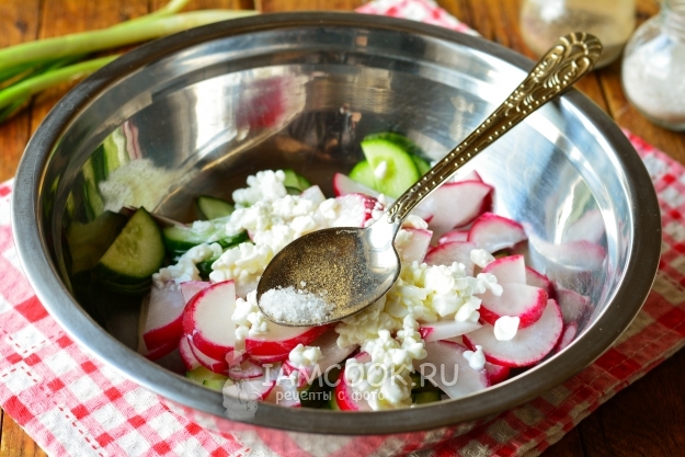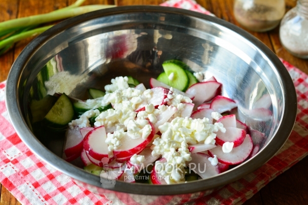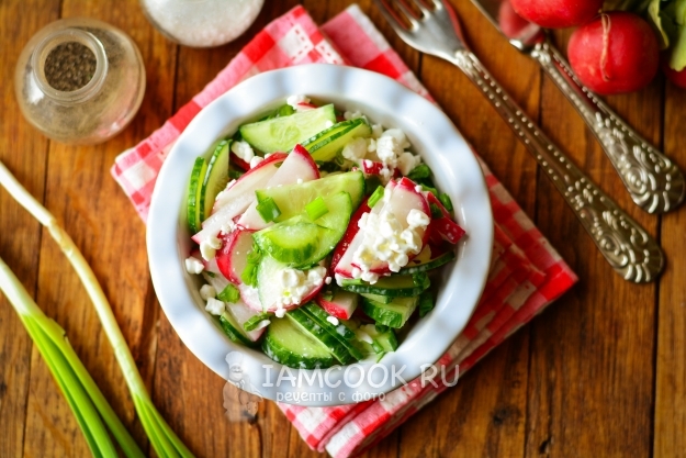 Готовый салат с редиской, огурцами и творогом перемешать и выложить в порционную посуду. Приятного всем аппетита!