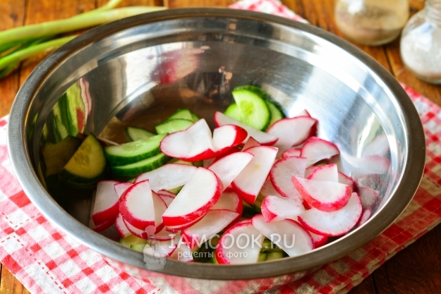 Редиску промыть и срезать хвосты. Нарезать также полукружочками и добавить в салат.