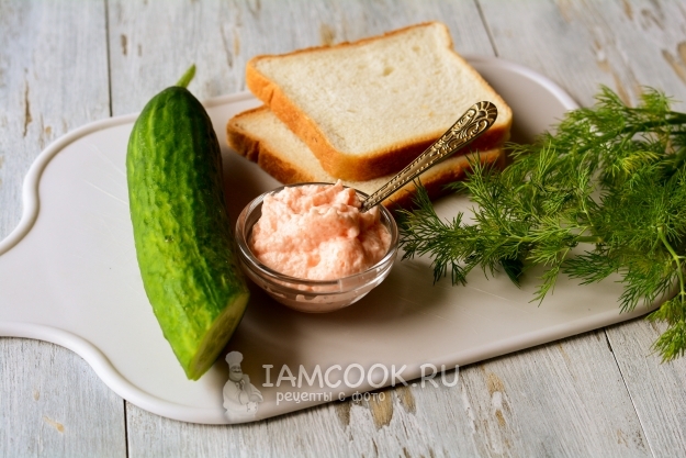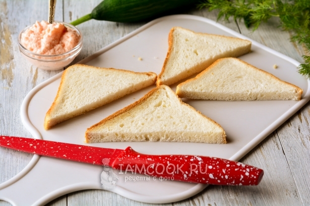 Подготовить хлеб: если кусочки крупные, разрезать их пополам. В таком виде бутерброды будут аккуратнее и их будет удобнее есть.