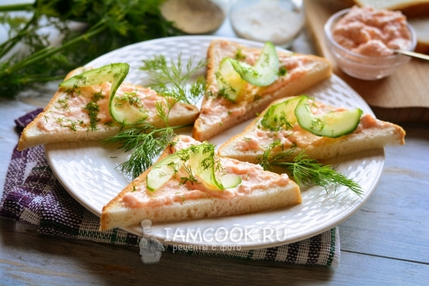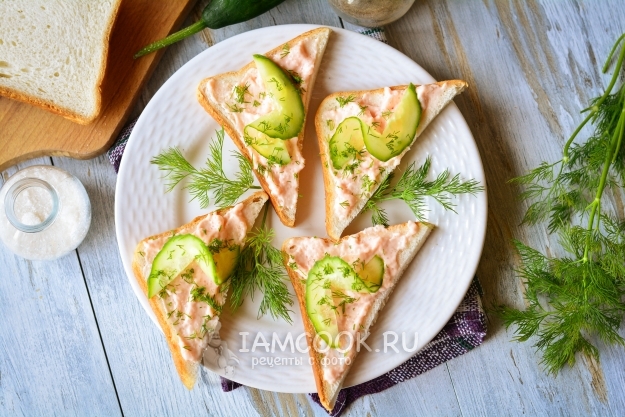 Сверху выложить кусочки свежего огурца. Можно разрезать кружки огурца по краю, чтобы свернуть в красивую форму. Присыпать бутерброды мелко нарезанным укропом.