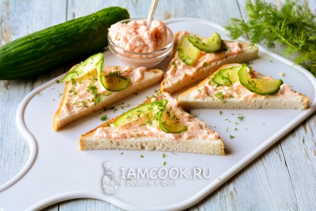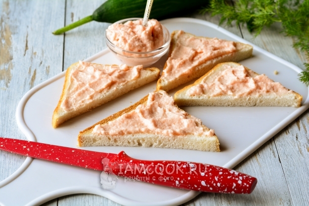 Смазать хлеб копченой икрой мойвы, нанести примерно одинаковый слой на каждый кусочек.
