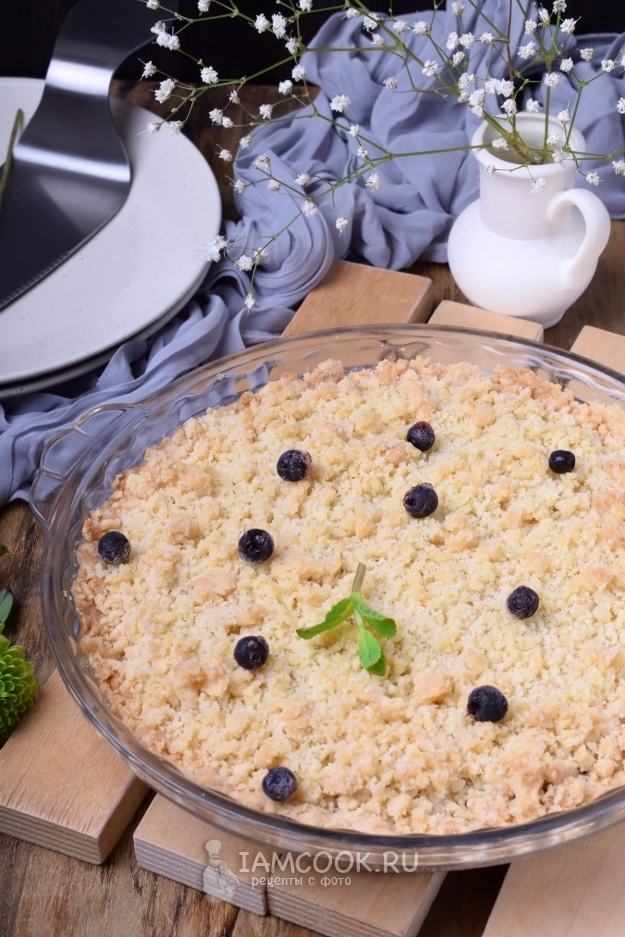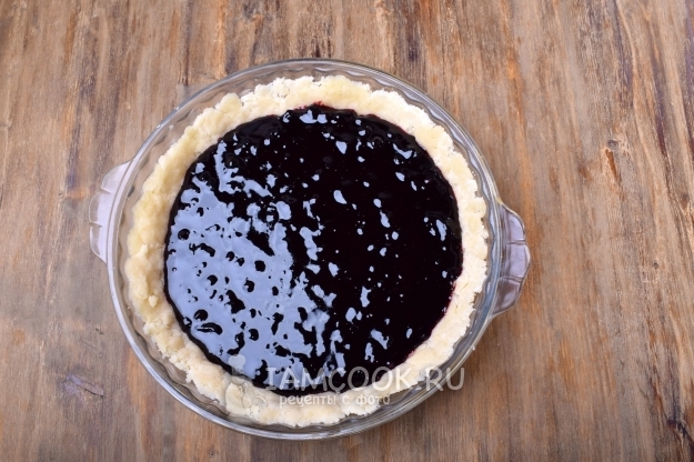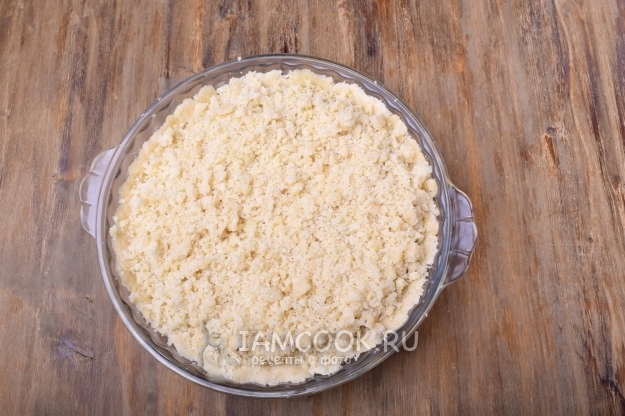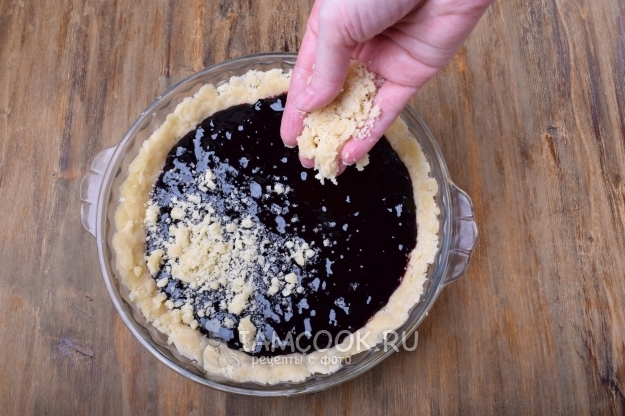 Оставшуюся (меньшую) часть теста раскрошим и выложим на начинку.